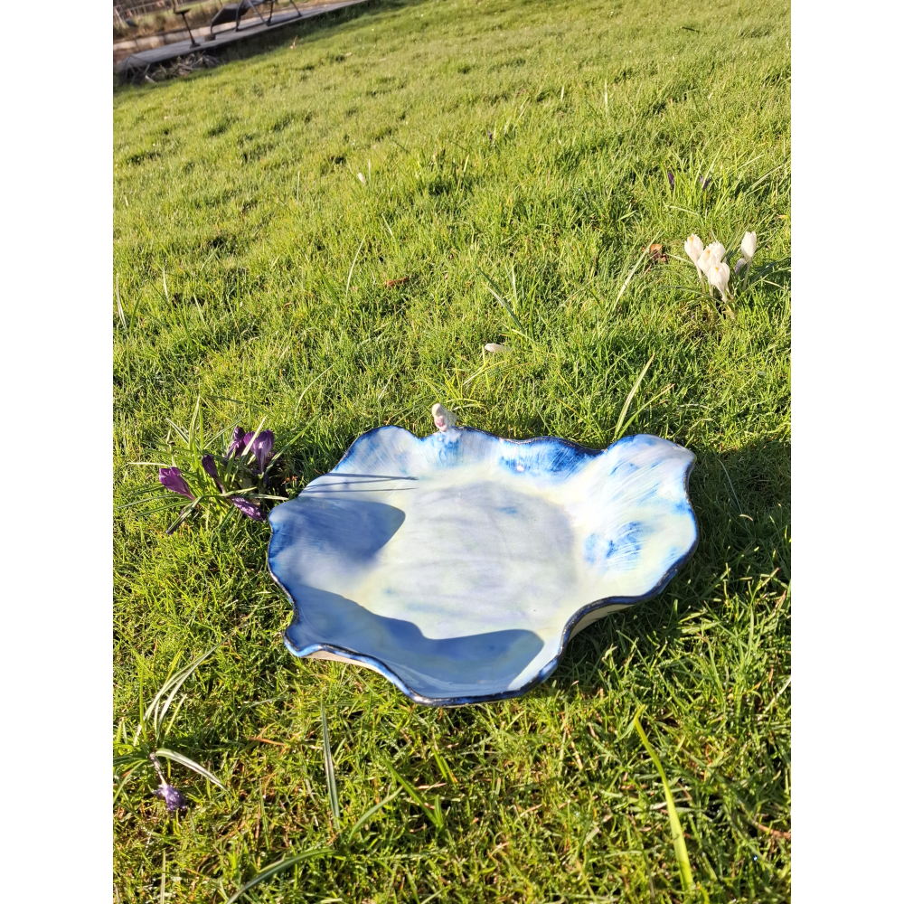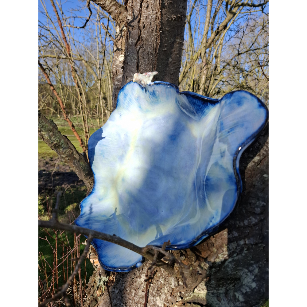 Grote schaal met vogel, ideaal als vogelbad in de tuin. De onderkant is niet geglazuurd.